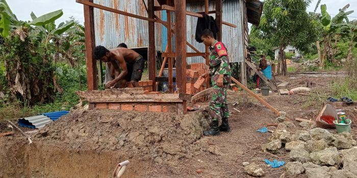 Sorong. Papua Barat Daya.- Ciptakan lingkungan sehat Babinsa Koramil 1802-03/Salawati Serda Duriat Subekti bahu membahu dengan masyarakat menyelesaikan pembangunan tempat MCK bertempat di dikampung malamay distrik mayamuk. Kabupaten Sorong. Senin (13/01/2025).