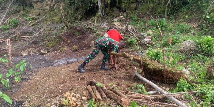 Pendim1809maybrat- Babinsa Pratu Roni melakukan kegiatan Komunikasi Sosial (Komsos) dengan bapak Nikolas Karet Yang Lagi berkebun. Distrik Ayamaru Utara, Kab. Maybrat, Papua Barat Daya. Senin,(17/02/2025).