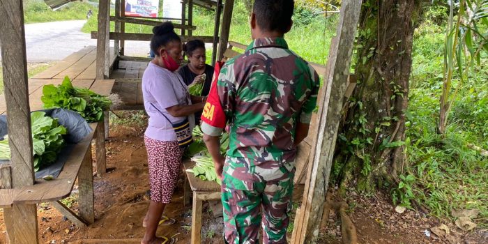 Pendim1809maybrat- Serda Puja melaksanakan Komsos dengan pedagang sayuran bertempat di Kampung isusu. Distrik Ayamaru TimurSelatan, Kab. Maybrat, Papua Barat Daya. Kamis,(01/08/2024).