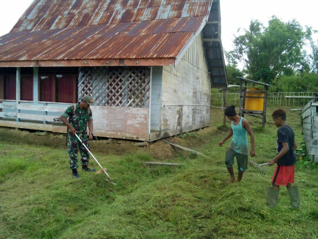 Sorong, Selasa (12/02/2019). – Dalam rangka memperkuat serta meningkatkan kebersamaan dengan warga masyarakat sehingga dapat mewujudkan kemanunggalan TNI dengan Rakyat, Babinsa Kampung Majemau Distrik Segun Koramil 1802-04/Seget Serda Taufik bersama warga binaan melaksanakan pembersihan di Gereja GKI Majemau, Selasa (12/02/2019).