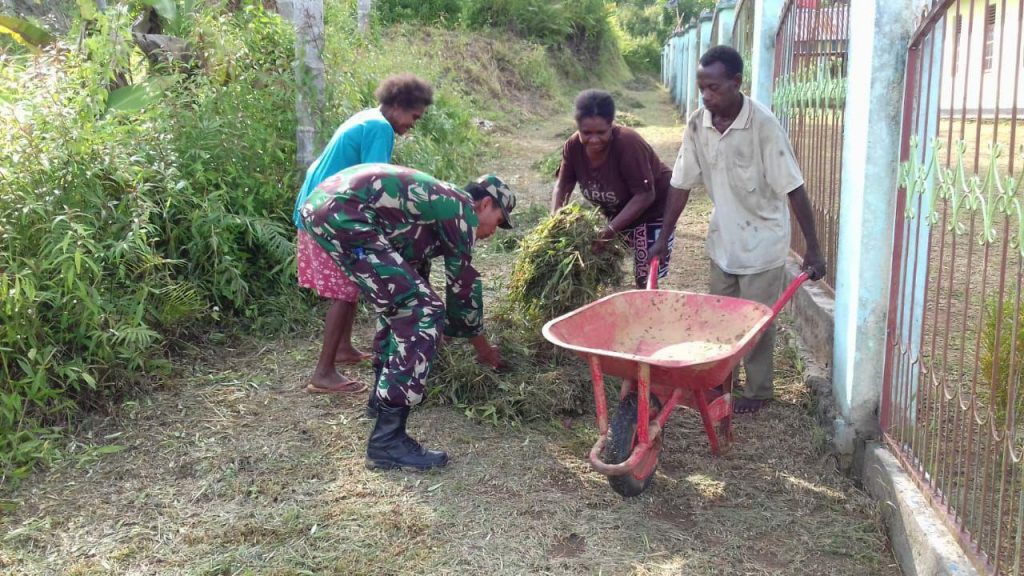 Sorong– Gereja GKI Imannuel yang terletak di Kampung Gisim Distrik Seget Kabupaten Sorong yang merupakan salah satu wilayah binaan Babinsa Kampung Gisim Babinsa Koramil 1802-04/Seget Kopda La Ode Hadiman merasa terpanggil jiwanya untuk bersama sama warga melaksanakan gotong royong pembersihan lingkungan Gereja dilanjutkan kegiatan pengecatan pagar gereja, Selasa (22/01/2019).