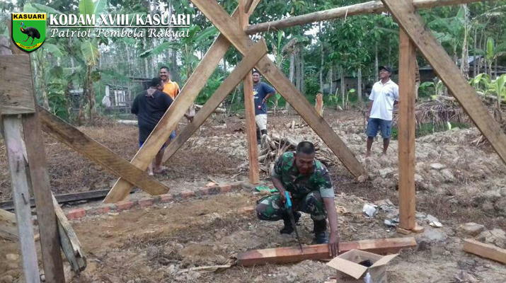 Sorong – Babinsa Koramil 1704-01/Sorong Timur melaksanakan karya bakti membantu membangun rumah warga binaannya yang bertempat di Maklalut dist Mariat kabupaten Sorong, Sabtu (15/04/2017).