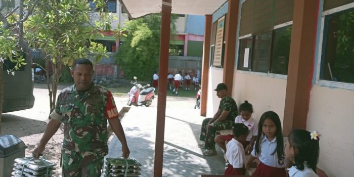 Babinsa Sorong Barat Dampingi pendistribusian Makan Bergizi Gratis Di 8 Sekolah Distrik Sorong Barat.