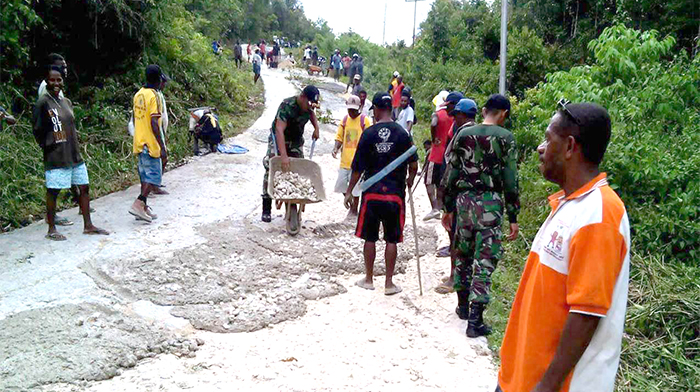 Melihat kondisi jalan yang menghubungkan Distrik Ayamaru dengan Ayamaru Selatan belum rata dan becek mendorong Babinsa Serda Suwarjono untuk bekerjasama dengan Kepala Distrik Ayamaru Selatan Pak Abe Lemauk beserta masyarakat biinaannya melaksanakan karya bakti perbaikan jalan dengan sasaran berupa pembangunan pengecoran jalan poros dan pembarsihan Parit, sehingga kondisi jalan dapat dilalui dengan lancer dan nyaman.