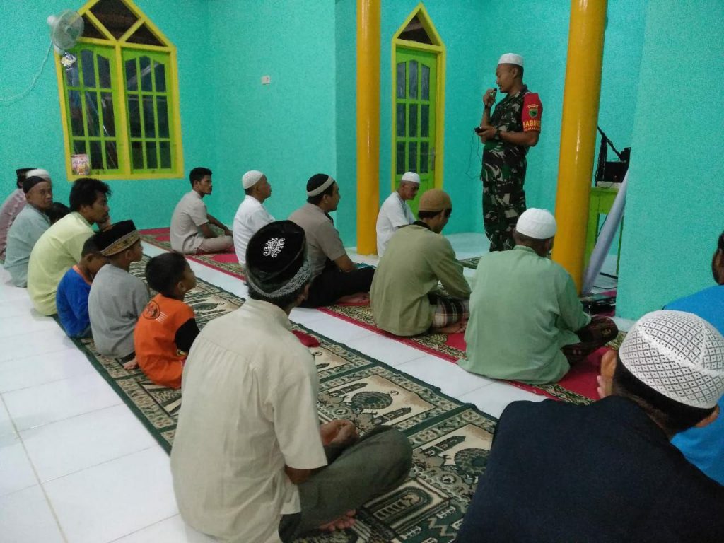Sorong, – Guna meningkatkan keimanan dan ketaqwaan kepada Sang Pencipta serta menjalin hubungan silaturahmi dengan warga binaan, Babinsa Kelurahan Malawele Koramil 1802-01/Sorong Timur Serda Eko Handoyo melaksanakan ceramah singkat bertempat di Masjid Ar Rahman Jalan Gambas Kabupaten Sorong. Sabtu (11/05/2019).