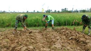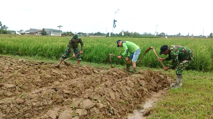 Sorong – Upaya khusus ketahanan pangan dalam pemeliharaan tanaman padi dan penghalusan bedengan dilahan ketahanan pangan Kodim 1704/Sorong, Danpos Ramil 1704-01/Sorong Timur Peltu Pamudji beserta Anggota lainnya melaksanakan pembuatan bedeng bertempat di Jalan Bandara Kelurahan Klamalu, Distrik Mariat, Kabupaten Sorong, Senin (06/08/2018).