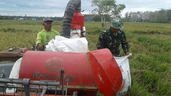 Sorong – Dalam rangka meningkatkan Swasembada pangan Nasional, Babinsa Koramil 1704-01/Sorong Timur Sertu Saptanto melaksanakan pendampingan kelompok tani Melati Jaya panen padi, Rabu (03/10/2018).