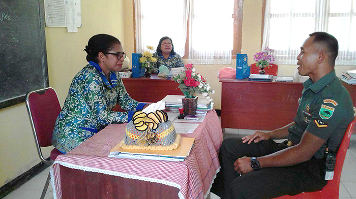 Sorong – Babinsa Koramil 1704-01/Sorong Timur Serda Sumiran melaksanakan komunikasi sosial (Komsos) dengan Kepala Sekolah Inpres 46, bertempat di Sekolah Inpres 46, Kelurahan Malamso, Kota Sorong, Kamis (20/04/18).