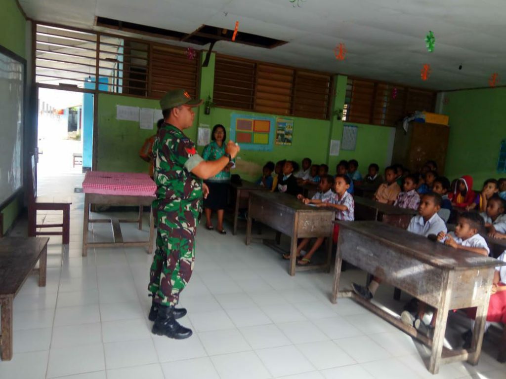 Sorong – Bertempat di Sekolah Dasar Inpres 36 Kampung Monoket Distrik Salsel Kabupaten Sorong, Babinsa Kampung Monoket Distrik Salsel Koramil 1802-04/Seget Koptu Yance Beda, mengajarkan dan mengajak kepada seluruh peserta didik untuk hidup sehat sejak usia dini dengan memelihara kebersihan diri melalui lingkungan baik di sekolah maupun dimana tempat kita tinggal agar terhindar dari penyakit, seperti Diare dan Demam Berdarah akibat nyamuk, Kamis (28/02/2019).