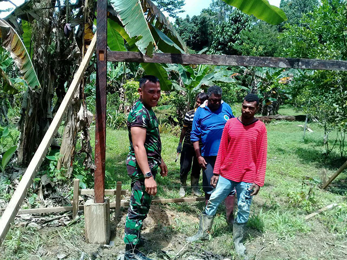 Sorong – Guna merangkul dan menciptakan sinergitas TNI Rakyat, Babinsa Kampung Fukoour Koramil 1704-08/Teminabuan Sertu Bambang bersama warga bergotong royong mendirikan rangka rumah milik Bapak Feliks Sailele selaku warga Kampung Fukoour Kabupaten Sorong Selatan, Kamis (30/08/2018).
