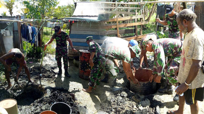 Dipimpin oleh Serka Doni bersama dengan warga masyarakat pembuatan jamban di rumah Bapak Yance Taune. Kegiatan pembuatan dimulai dengan penggalian lubang septic tank yang belum memiliki jamban.