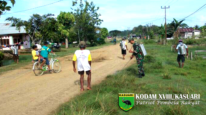 Sorong – Babinsa Koramil 1704-06/Salawati melaksanakan karya bakti bersama masyarakat binaannya dalam membantu penyemprotan rumput dijalan Kampung Walal Kabupaten Sorong, Senin (17/04/2017).
