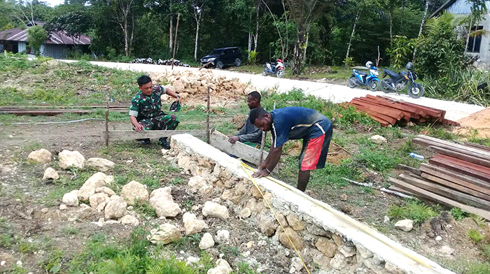 Sorong – Babinsa Koramil 1704-04/Teminabuan Sertu Husni Tanamal melaksanakan gotong royong dalam membantu memasang pondasi rumah di Kampung Wernas Distrik Teminabuan pada salah satu rumah masyarakat Bapak Jon Sagisolo, Kamis (16/11/17).