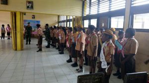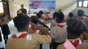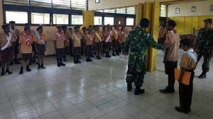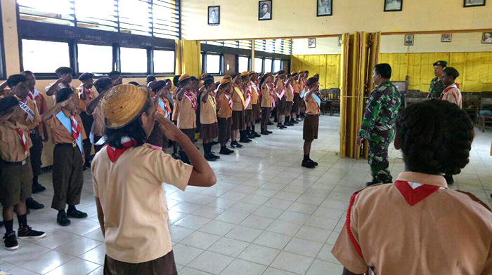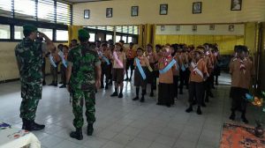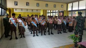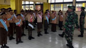 Sorong – Bertempat di SMPN 6 Kampung Klamono, Distrik Klamono, Kabupaten Sorong, Babinsa Koramil 1704-06/Beraur Serda Darwis bersama anggota babinsa lainnya memberikan materi Wawasan Kebangsaan, Bela Negara, PBB dan Latihan Upacara Bendera kepada Siswa/siswi peserta didik baru SMPN 6 Kabupaten Sorong dalam rangka Masa Pengenalan Lingkungan Sekolah (MPLS), Selasa (17/07/2018).