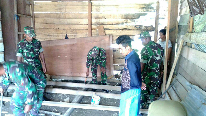 Sorong – Babinsa Koramil 1704-02/Sausapor Serda Satria membantu warga masyarakat binaannya Bapak Laode Amin dalam rangka penyekapan kayu dan pemasangan papan yang akan digunakan untuk membuat kios bertempat di Kampung Emaus, Distrik Sausapor, Kabupaten Tambrauw, Senin (06/11/17).