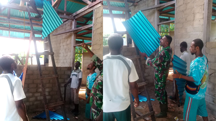 Kaimana – Babinsa Koramil 1713-01/ Kaimana serda S simora bersama masyaraka, memasang seng rumah milik Bapak Martinus, bertempat di Kel Krooy, Distrik Kaimana, Kabupaten Kaimana, Papua Barat, Rabu (08/11/2017).