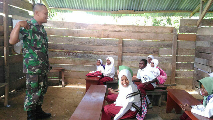 Seperti halnya yang dilakukan Babinsa Koramil 1704-01/Sorong Timur Serma Hamim dalam memberikan Wawasan Kebangsaan (Wasbang) kepada pelajar SD Al-Mu’arif Klalin 4 di Kampung Maibo Kota Sorong.