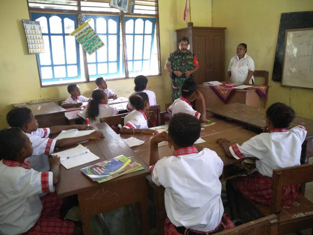 Fakfak – Bertempat di SD Inpres Weri, Distrik Fakfak Timur, Kabupaten Fakfak, Babinsa Koramil 1803-03/Fakfak Timur, Sertu Basri Pioner memberikan materi wawasan kebangsaan kepada siswa-siswi SD Inpres Weri guna menumbuhkan Jiwa Nasional dan Pancasila pada Generasi Muda, Selasa (12/02/2019).