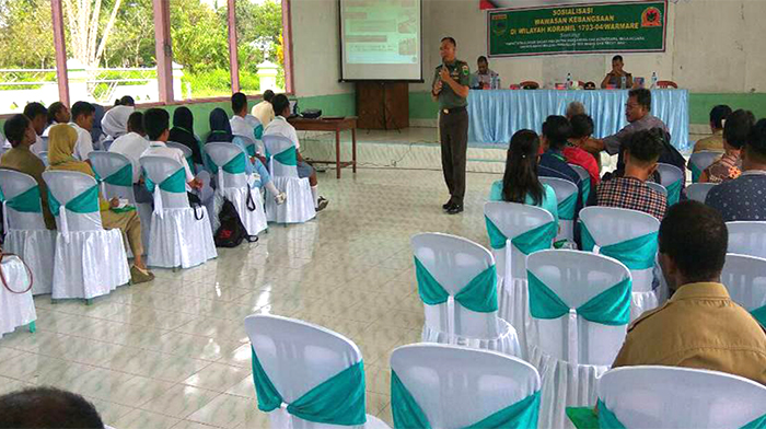 Manokwari – Wawasan Kebangsaan sangat penting untuk dipahami oleh Komponen Masyarakat, sudah menjadi tugas dan tanggung jawab Satuan Komando Wilayah (Satkowil) Teritorial TNI AD untuk mensosialisasikan kepada Masyarakat di wilayah binaannya, seperti halnya yang dilakukan oleh Danramil 1703-04/Warmare Lettu Inf Sudiyantoro melaksanakan kegiatan pemberian materi wawasan kebangsaan kepada PNS, Aparat Kampung,pemuda dan siswa Sekolah di Distrik Masni bertempat Aula Distrik Masni, Kab. Manokwari, Prov. Papua Barat, Senin (23/10/2017)