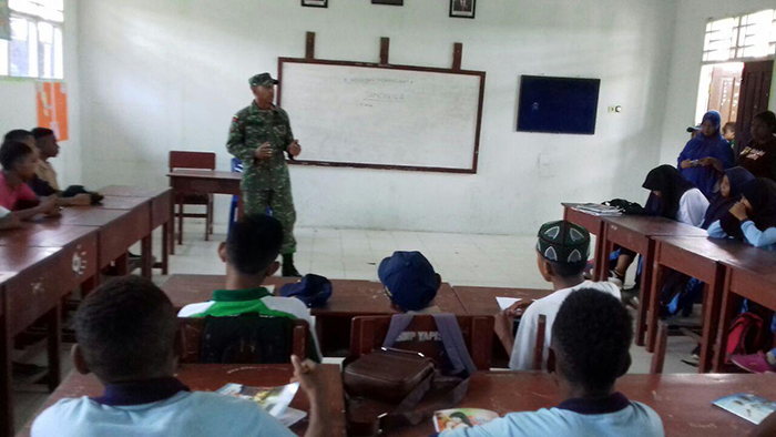 Teminabuan – Babinsa Koramil 1704-04/Teminabuan Serda Soni Gaite melaksanakan pemahaman wawasan kebangsaan dengan materi Pancasila, kepada 30 Orang Siswa SMP Yapis Teminabuan Kab Sorong Selatan, Senin (04/09/2017).