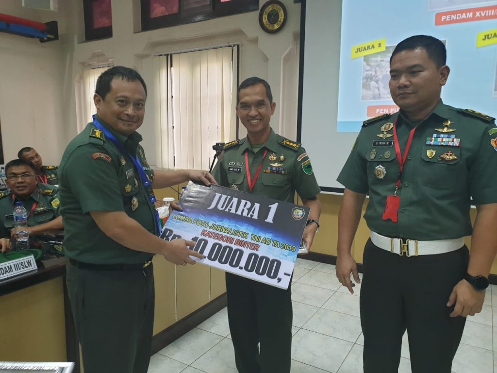 Kepala Penerangan Kodam (Kapendam) XVIII/Kasuari Kolonel Inf Andi Gus Wulandri, S.I.P., Rabu (11/12/2019) di Markas Dinas Penerangan Angkatan Darat (Madispenad) Jakarta, menerima hadiah atas prestasi Pendam XVIII/Kasuari yang telah berhasil meraih predikat Juara I Lomba Foto Jurnalistik TNI AD Tahun Anggaran (TA) 2019 bertema Pembinaan Teritorial (Binter) yang digelar di Dinas Penerangan Angkatan Darat (Dispenad). Foto Binter Pendam XVIII/Kasuari berhasil menjadi Karya Foto Terbaik, mengungguli foto-foto dari 14 Pendam lainnya dan beberapa Satuan Penerangan Badan Pelaksana Pusat (Balakpus) di jajaran TNI AD.