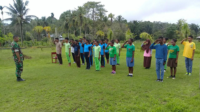 Salawati – Babinsa Koramil 1704-06/Salawati Serma Sutarno memberikan materi Wawasan Kebangsaan (WasBang) dan Peraturan Baris-Berbaris (PBB) di SMA Negeri 1 Salawati Kab Sorong, Senin (02/10/17).