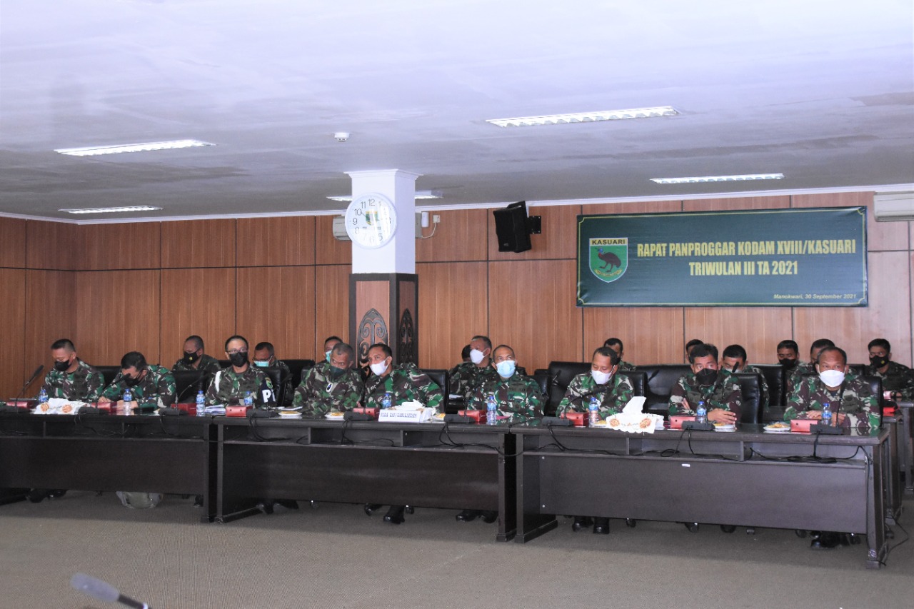 Rapat ini bertujuan untuk mengukur perencanaan atau capaian pelaksanaan program kerja dan anggaran Kodam XVIII/Kasuari sampai dengan TW III TA. 2021, menginventarisasikan hambatan dan kendala serta meluruskan solusi pemecahan permasalahan dalam rangka meningkatkan kinerja.