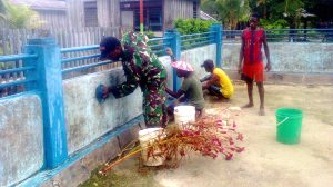 Sorong – Sebagai wujud kepedulian terhadap lingkungan wilayah binaannya, Babinsa Koramil 1704-03/Saonek Sertu Petrus Rumbiak bersama masyarakat melaksanakan kegiatan karya bakti pengecatan pagar gereja Laharoi…