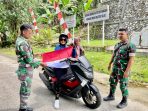 Korem 182/Jazira Onim-Tampak Sejumlah Prajurit Korem 182/Jazira Onim membagikan Bendera Merah Putih kepada warga yang melintas di depqn Makorem 182/JO Jalan Poros Kiat bandara Siboru,…