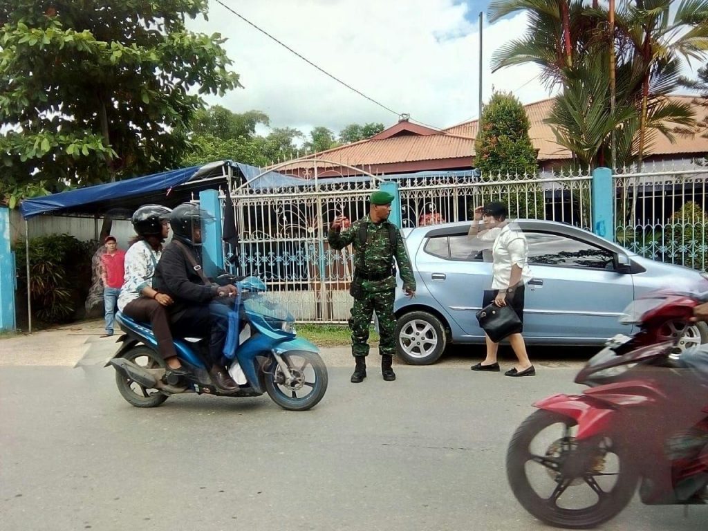 Sorong – Disamping tugas dan tanggung jawab Bintara Pembina Desa (Babinsa) sebagai satuan teritorial yang berhadapan langsung dengan Masyarakat. Tak heran bila Babinsa Koramil 1704-01/Sorong Timur Serda La Nuba berperan membantu tugas aparat Polri dalam mengatur lalu lintas agar tidak terjadi kemacetan dikarenakan keramaian kendaraan di rumah duka Bapak Yance Lauw (Warga wilayah binaan) di Kelurahan Klagete Kota Sorong, Selasa (26/06/2018)