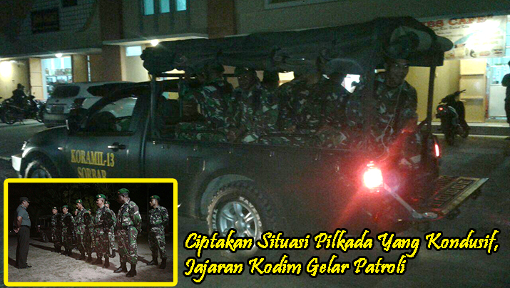 Sorong – Guna meningkatkan keamanan dan kenyamanan masyarakat selama Pilkada 2017 di wilayah jajaran Kodim 1704/Sorong dan sekitarnya, Koramil Sorong Timur dan Sorong Barat melaksanakan Patroli guna ciptakan kondisi aman bagi masyarakat serta menjaga keamanan dan mempersempit ruang gerak kriminal di Kota dan Kabupaten Sorong, Jum’at (10/02/17).