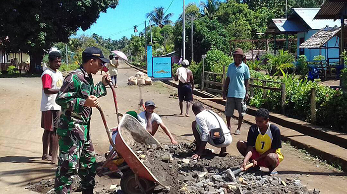 Kabare – Babinsa Koramil 1704-09/Kabare Jajaran Kodim 1704/Sorong Sertu Eko Sutopo bersama Kopda Hamirun melaksanakan karya bhakti bersama masyarakat melaksanakan penimbunan jalan di Kampung Darundap Kab Raja Ampat, Sabtu (20/05/17).