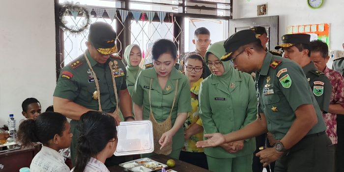 Dandim 1801/Manokwari Kolonel Inf Agus Prihanto Donny S.Sos,. M.Han dan Ketua Persit KCK Cabang XII Manokwari dampingi Pangdam XVIII/Kasuari Mayjen TNI Jimmy Ramoz Manalu, S.Hub.Int., M.H.I dan Ketua Persit KCK PD XVIII/Kasuari melakukan peninjauan pelaksanaan program makanan bergizi gratis di SD YPK 04 dan SD YPK 14 Maranatha Kota, Kabupaten Manokwari, Provinsi Papua Barat, Kamis (13/02/2025).