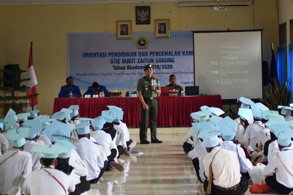 Sorong – Strategis Untuk menumbuhkan rasa cinta tanah air bagi Pemuda dan Pemudi penerus Bangsa, Komandan Kodim 1802/Sorong Letkol Inf Budiman, S.E., M.I.Pol., M.M. memberikan Wawasan Kebangsaan kepada Mahasiwa dan Mahasiswi baru Universitas STIE Bukit Zaitun Kota Sorong Tahun akademik 2019/2020 bertempat di Aula Kampus, Jumat (16/08/2019).