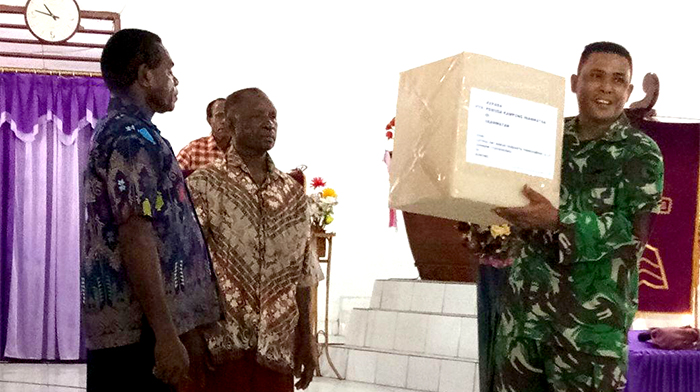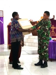 Pemberian sumbangan dalam hal ini yang diwakilkan oleh Pelda Alex Arloy yang merupakan Bati Bhakti TNI Anggota Koramil 1704-11/Inanwatan.