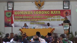 Sorong Kodim 1704/Sorong menggelar kegiatan Kominda Sorong Raya yang mengambil tema “Dengan semangat Bhinneka Tunggal Ika Kita Tingkatkan Kerukunan Antar Masyarakat, Suku Dan Agama” bertempat di Aula Pandu Sakti Makodim 1704/Sorong.  Kegiatan Komunitas Intellijen Daerah atau KOMINDA yang bertujuan untuk mencegah dan mengatasi berbagai konflik yang mungkin akan terjadi di daerah. Acara dimulai dengan menyanyikan lagu Indonesia Raya, Rabu (28/03/2018).