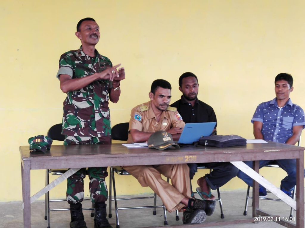 Fakfak – Bomberay, Danramil 1803-05/Bomberay Lettu Inf Zainudin, melaksanakan Komunikasi Sosial, dan Sosialisasi Penerimaan calon Tamtama PK TNI AD dengan Tokoh Masyarakat, Tokoh Agama dan Tokoh Adat Kampung Bumi Moro Indah, Distrik Bomberay, Kabupaten Fakfak, Selasa (12/02/2019).