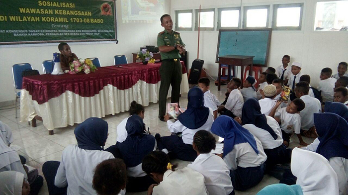 Manokwari – Guna menumbuhkan jiwa patriotisme cinta terhadap bangsa dan tanah air, Danramil 1703-08/Babo Letda Inf Fachry M. B melaksanakan Kegiatan Sosialisasi Wawasan Kebangsaan kepada siswa-siswi SMP dan SMA sebanyak 128 orang di Aula SMU Negeri Babo Distrik Babo Kab. Teluk Bintuni Prov. Papua Barat, Senin (16/10/2017).