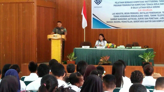 Sorong – Kegiatan Teritorial Wawasan Kebangsaan yang dilaksanakan Kodim 1704/Sorong melalui Koramil jajarannya terus dilakukan tidak terkecuali Danramil 1704-01/Sorong Timur Mayor Inf H. Triyana, S.Pd.I M.Pd.I yang memberikan pembekalan Wawasan Kebangsaan (Wasbang) dengan materi kedisplinan kepada peserta latihan kerja yang berjumlah 246 Orang bertempat di Aula Balai Latihan Kerja Kota Sorong, Rabu (07/02/18).