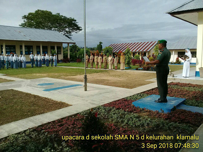 Kepala Sekolah SMAN 5 Bapak Yance Saptanto, S.Ag memberi apresiasi “Kami berterima kasih kepada pihak Koramil 1704-01/Sorong Timur yang telah meluangkan waktunya untuk menjadi Irup dalam upacara yang digelar di sekolah pada setiap hari Senin, kegiatan ini nantinya menjadi bekal bagi pelajar disekolah kami ini”. Harapnya.