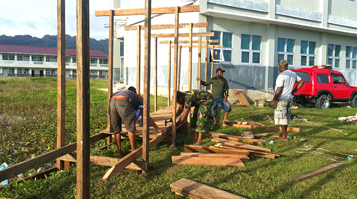 Kaimana – Danramil 1713-03/ Teluk Arguni Kapten Inf Roby Daud Samangun beserta Babinsa dan panitia pesparawi bahu membahu menyiapkan sarana prasarana yang akan di gunakan paserta pesparawi dan menyukseskan pelaksanaan pesparawi ke XII Tahun 2017, baik Prov Papua maupun Papua barat bertempat di kabupaten Kaimana, Selasa (14/08/2017).