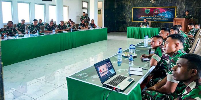 Danrem 182/JO, Kolonel Inf Aswin Kartawijaya selaku Dankolakops (Komandan Pelaksana Operasi) Bacakan Perintah Operasi dan Berikan Pengarahan Kepada Prajurit BTP 805/KSW di Rindam XVIII/Ksr, yang langsung di Sambut oleh Danrindam XVIII/Ksr Kolonel Inf Slamet,S.Sos., M.Han., Para PJU Rindam, Dandim 1805/Mansel Letkol ARM Adi Suroyo S.Sos., Danyonif BTP 805/KSW Mayor Syahrul Usman,S.H beserta Para Perwira Rindam XVIII/Ksr dan Perwira Yonif BTP 805/KSW, bertempat di Rindam XVIII/Ksr Jl. Trans Manokwari – Bintuni, Kamp. Dembek, Dist. Momi Waren, Kab. Manokwari Selatan, Prov. Papua Barat, Selasa (12/11/2024).