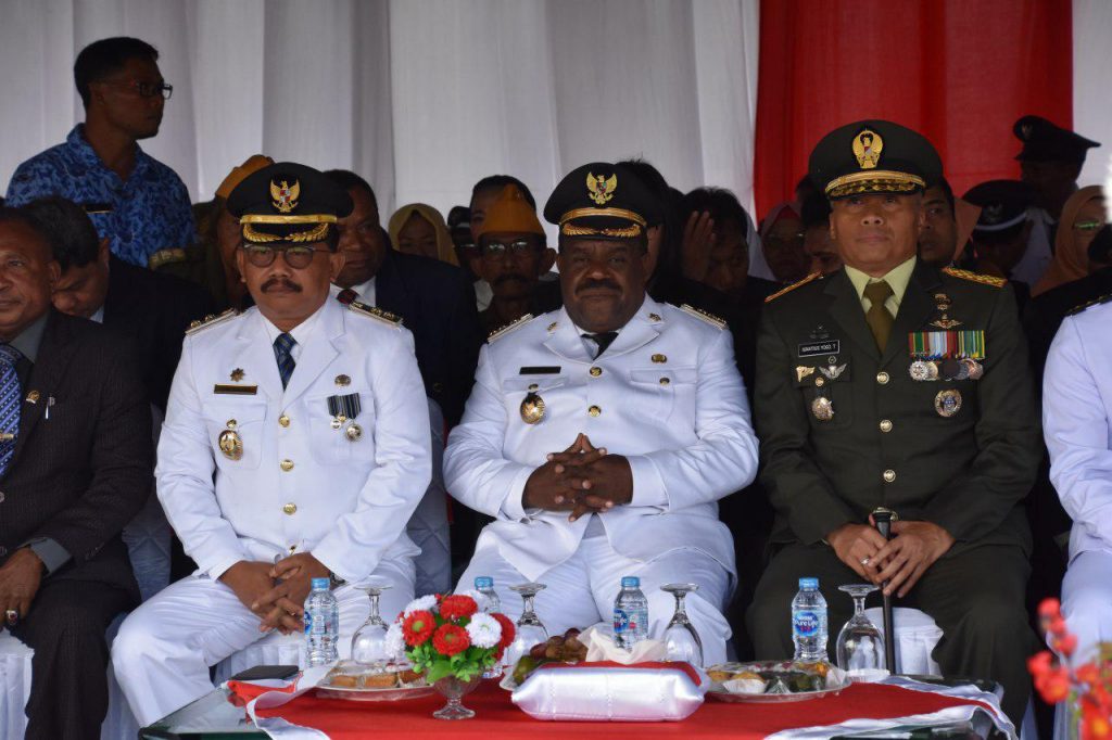 Upacara Pengibaran Bendera HUT ke-74 Kemerdekaan RI Tahun 2019, Pemerintah Kabupaten Sorong bertempat di Lapangan Alun-alun Aimas, Kabupaten Sorong-Papua Barat dengan Inspektur Upacara Bupati Kabupaten Sorong DR.Jhony Kamuru,SH.M.Si., dihadiri oleh Danrem 181/PVT Brigjen TNI Ignatius Yogo Triyono, MA., Wakil Bupati Sorong Suka Harjono, S.Sos.M.Si, Kasi Intel Rem 181/VPT Kolonel Inf.Albert Panjaitan, Kasi Ops Rem 181/PVT Kolonel Inf.Arifin Simanjuntak, Kasi Terrem 181/PVT Kolonel Inf Luhut Bernandus Sidabariba S.I.P, Asintel Danlantamal XIV Kolonel Mar Rokhman, Asintel Pasmar 3 Kolonel Mar Ferdy Takaendengan, Aspers Pasmar 3 Kolonel Mar Purwanto Hadi S., Danmen Kav 3 Mar Kolonel Mar Bayu Kelana Putra, Dandim 1802/Sorong Letkol Inf.Budiman, SE.M.I.Pol.MM., Danyon 762/VYS Letkol Inf. Doddy Yudha.S.IP, M.Tr(Han), Dandenpom XVIII/Sorong Letkol Cpm. Noerhadi,SH, Wadanmen Banpur 3 Mar Letkol Mar Sunardi, Paban Prs Pasmar 3 Letkol Mar Franklin, Paban Srena Pasmar 3 Letkol Mar Heru Gunawan, Paban Sintel Letkol Mar Setiyo, Kapolres Sorong AKBP. Dewa Made Sidan Sutrahna,S.Ik, Danden Zipur 13/PPA Mayor Czi.Bayu, Pasprs Brigif 3 Mayor Mar Hermawan, Pabandya Ops Pasmar 3 Mayor Mar Irwan Abidin, Pabandya Srena Pasmar 3 Mar Mar Henderi, Wakapolres Sorong Kompol La Ode Pandi, SH, Sekda Kab. Sorong Ir.H.M.Said Noer, M.Si, Ketua DPRD Kab Sorong Adam Klow, SH.S.Pak, Pimpinan Organisasi Perangkat Daerah ( OPD ) dilingkungan Pemda Kab. Sorong, Pimpinan Organisasi Wanita, Tokoh Agama, Tokoh Masyarakat dan Tokoh Pemuda.