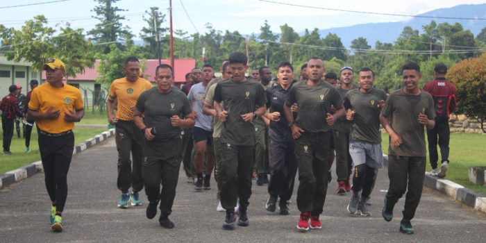Momi Waren – Danrindam XVIII/Ksr Kolonel Inf Slamet, S.Sos.,M.Han., pimpin Apel Perdana Olahraga Bersama Prajurit Rindam XVIII/Ksr dan Bataliyon 805/KSW, bertempat di Lapangan Upacara Mako Rindam XVIII/Ksr, Jl. Trans Manokwari – Bintuni, Kamp. Dembek, Dist. Momi Waren, Kab. Manokwari Selatan, Papua Barat, Jumat (03/01/2025.