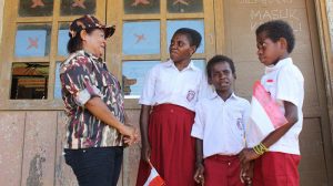 Sorong – TNI Manunggal Membangun Desa (TMMD) Reguler Ke – 101 yang di pusatkan di Kampung Sailala Distrik Sayosa Timur Kabupaten Sorong selain personil dari TNI yang tergabung dalam satgas TMMD ke – 101 Kodim 1704/Sorong, juga terlibat Forum Komunikasi Putra Putri Purnawirawan Indonesia (FKPPI) yang ikut membantu kegiatan sasaran non fisik memberikan wawasan kebangsaan kepada anak SD Inspres 8 Sailala Distrik Sayosa Kab Sorong, Jumat (06/04/2018).