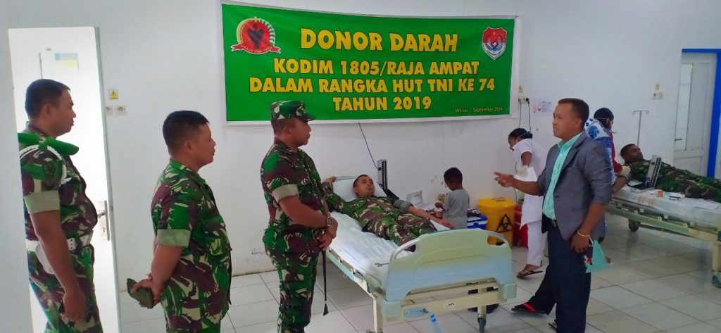Demikian diungkapkan Direktur RSUD Raja Ampat, dr. Agus Hariyanto, S.pB saat pelaksanaan Donor Darah yang digelar oleh Kodim 1805/Raja Ampat, Selasa (17/9/2019) dalam rangka memperingati HUT Ke-74 TNI tanggal 5 Oktober 2019, bertempat di Ruang Palang Merah Indonesia (PMI), Kompleks Rumah Sakit Umum Daerah (RSUD) Kabupaten Raja Ampat, Jl. Trans Waisai – Warsambin, Kelurahan Warmasen, Distrik Waisai, Kabupaten Raja Ampat, Provinsi Papua Barat.