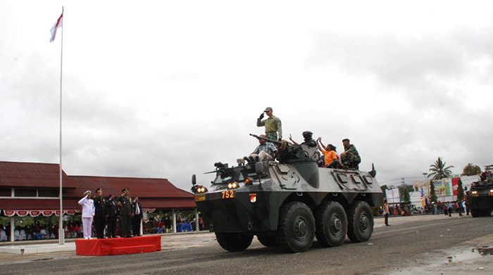 Sorong – Upacara Bendera HUT ke-72 TNI Tahun 2017, prajurit dan PNS TNI se-Garnizun Sorong dengan Irup Kepala Staf Korem 171/PVT Kolonel Inf Dian Sundiana,S.E,M.M, dihadiri oleh Wadan Lantamal XIV/Srg Kolonel Mar Anif Hidayat, para Asisten Lantamal XIV/Srg dan Kasi Korem 171/PVT, para Komandan Satuan Dan Ka Balak Aju jajaran Korem 171/PVT dan Lantamal XIV/Srg, Unsur Muspida Kota dan Kabupaten sorong, bertempat di Lapangan Alun-alun Aimas Kabupaten Sorong-Papua Barat, Kamis (05/10/17).