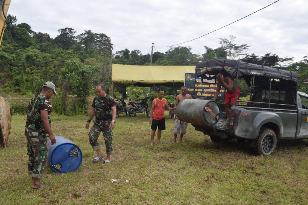 Sorong – Danramil 1802-04/Seget Lettu Inf Subi Sagi yang pada saat itu menjabat sebagai Pawas TMMD bersama Anggota Satgas TMMD ke-105 menurunkan BBM Jenis Solar di lokasi TMMD untuk alat berat Ekskavator yang sedang membuka badan jalan di Kampung Aisa Distrik Aifat Timur Kab.Maybrat, Jumat (19/07/2019).