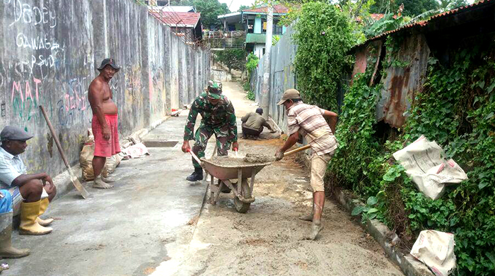 Sorong – Babinsa Kampung Kodok Koramil 1704-13/Sorong Barat bersama Ketua RW 2 H Ladang Raya dan warga Kampung Kodok melaksanakan karya bakti pengecoran jalan yang rusak dilingkungan kampung Kodok kelurahan Klabala Sorong, Kamis (04/01/18).