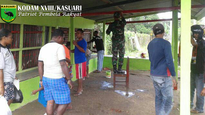 Sorong – Serda Susiswo, Babinsa Koramil 1704-01/Sorong Timur, melaksanakan Karya Bhakti membantu para Tukang Ojek dalam pengecatan pangkalan ojek di Jl. Malibela RT 002 /RW 002 Kelurahan Klawalu, Sorong Timur, Kota Sorong, Senin (17/04/17).
